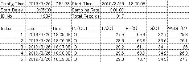 | ■特長 ●WBGT指数のアラーム設定が可能(20.0~50.0℃) ●最大12,000ポイントの測定データを記録・保存できます 年月日、時刻、WBGT指数、温度、相対湿度、IN/OUT設定の7項目を1ポイントとして、最大12,000ポイントのデータを内蔵メモリに記録できます。(測定間隔1分で、連続約8日間の測定データを記録することができます) ●USB通信ケーブルを本体とパソコンに接続 内蔵メモリに記録された測定データをパソコンに保存することができます。特別なソフトウエアをインストールする必要はありません。 記録された測定データはCSV形式でファイルに出力して保存することができ Excelなどの表計算ソフトウエアで開き、データ解析できます。 ●保存されたCSVファイルの測定データ例 ![]() ●データ記録開始の遅延時間が設定可能(スタート遅延機能) 複数台の熱中症指数計/熱中症指数データロガーを同時に記録開始できます。 スタート遅延時間0分、2分、5分、30分、45分、60分、90分、120分、12時間から選択 ●データ記録間隔(サンプル間隔)の時間設定が可能 1分、2分、5分、10分、30分、60分、90分、120分から選択 ![]() ●熱中症指数計/熱中症指数データロガーのID番号の設定が可能 複数台使用しても識別が可能 ●パソコン画面で測定条件を簡単設定、日本語の設定画面表示 設定項目は、パソコン画面の言語(日本語、英語、中国語、ドイツ語、フランス語、イタリア語、スペイン語、ポルトガル語)、データロガーのデータ記録間隔、スタート遅延時間、ID番号の4項目のシンプル設定 ●直径75mmの全球形石川式黒球により、安定した測定が可能 ●使用場所に合わせて屋内(室内IN)と屋外(室外OUT)のモード選択が可能 ●市販のカメラ用三脚に取り付け可能(三脚穴寸法1/4-20UNC) ●WBGT指数、温度、湿度の同時表示.黒球温度は切替表示 ●最高値、最低値のメモリー機能 ●表示ホールド機能 ■仕様