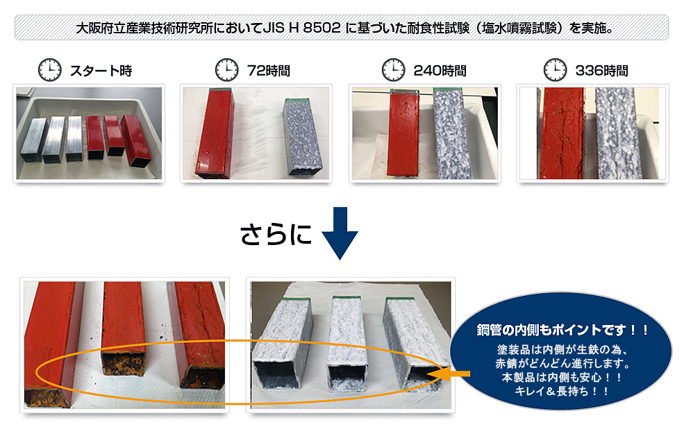 ■使用イメージ![]() ■特徴 ●優れた耐食性 錆びにくく長持ちするため、在庫保管時のコストを削減。 一般的に腐食速度は、使用環境、使用期間よって異なりますが、亜鉛は鉄の10~25倍の耐食性を有しています。また、亜鉛めっき皮膜になんらかの理由で傷が生じた場合、周囲の亜鉛が陽イオンとなって鉄の腐食を抑制し電気化学的に保護する犠牲防食作用を有しています。この鉄に対する亜鉛の犠牲防食作用は、亜鉛独特の防食作用です。また、塗装や電気めっき等とは異なり、亜鉛と鉄との間にできた「合金層」により、亜鉛と鉄が強く結合しているため、長い年月を経てもめっきが剥がれることがありません。 ●高い衛生性 ジャンル・場所を問わず、様々な業種の用途にご利用可能。 塗装仕上げに比べて塗膜の剥がれ落ちがなく、サビ落ちがないので保管中の商品の汚れの心配が少なく、清潔感があ ります。特に沿岸部の倉庫で起こりやすい塩害による腐食防止には効果が大きい特性を発揮します。 ●塗装品に比べて有機溶剤の使用量が少なく、エネルギーの消費量も少ない為、環境に優しい。 ■耐食性試験 <スタート時> 左側が本製品。右側が従来塗装。 <72時間> 塗装品は所々にサビが発生しはじめており、わずかながらサビ汁もでている。 本製品のメッキ鋼管は亜鉛の腐食生成物が少し見られるが、鋼管の素地(鉄の部分)にはダメージがない。 <240時間> 塗装品は所々のサビ発生と同時に、塗膜の内部のサビによる表面変化が表れはじめる。 本製品のメッキ鋼管は亜鉛の腐食生成物が表れているだけで、鋼管の素地にはダメージがない。 <336時間> 塗装品は表面のダメージが著しく塗膜内部で腐食したサビが塗膜を押し上げることによってブヨブヨしており、少し触るだけで、塗膜が捲れ落ちていく。 本製品のメッキ鋼管は亜鉛の腐食生成物が表れているだけで、依然として鋼管の索地にはダメージがない。 ![]() 乾燥後には、本製品のメッキ鋼管は亜鉛の犠牲防食作用により新たな皮膜を形成し始め、まったく赤サビを発生させず、さらに強固な耐食性を保持。 一方塗装品は、ドンドン赤サビが進行し、塗膜の剥げ落ちがひどくなります。また、気付かないうちに鋼管の内部が腐食するため、耐荷重にも影響が現れます。 ■過酷な環境下でも、その特性を大いに発揮し、塗装品よりも圧倒的に耐食性が強い ●塩害による腐食の厳しい沿岸部の倉庫や、 ●温度や湿度変化の激しい場所や、 ●野ざらしの保管にも ■タイプ