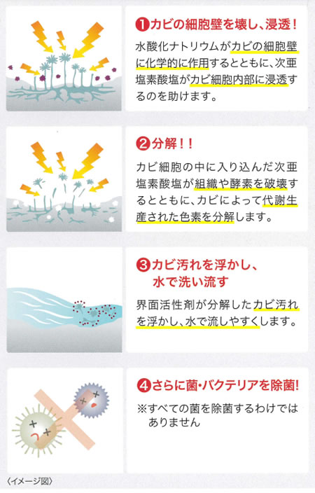 | 電動だから手が疲れない! カビトリ電動スプレー 3つの主成分 ・次亜塩素酸塩 ・水酸化ナトリウム ・界面活性剤 +独自の強力浸透成分を配合 ![]() ■特長 ●スプレー時間を約1/5に短縮できる 電動だから、短時間でカビ取り掃除ができます。 たった1度、軽くレバーを引き続けるだけで、液が自動でスムーズに噴射されるので、 カビ取り掃除1回あたりのスプレー時間を約1/5に短縮できます。 ●清掃業務の効率化 オフィスやホテル、福祉施設など、不特定多数の方が使用する大浴場など塗布面積の広い清掃で大活躍です。 浴室内の壁やタイル・目地、マット・小物類、シャワーカーテン、扉等のゴムパッキンのカビ汚れを効率的に除去できます。 ※材質によっては変色することがあるので、必ず目立たない場所で試してから使用ください。 ■カビを退治するメカニズム ![]() ■仕様
