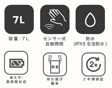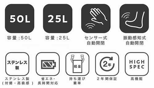 | ●センサー、振動感知式で自動開閉、ゴミ捨てが清潔&ラクラクなゴミ箱です。 (M3228NT-50S/M3228NT-25Sタイプ) ●センサー式で自動開閉、防水タイプです。 トイレ等の水回りにも設置可能なゴミ箱です。(M3228NT-7Sタイプ) ![]() ![]() ![]() ![]() ![]() ![]() ![]() ■タイプ
