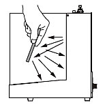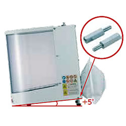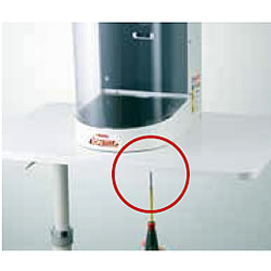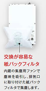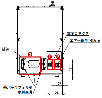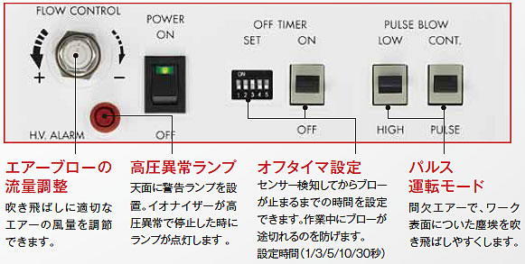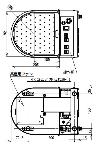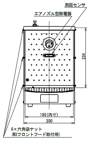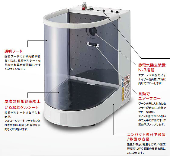 | 業界初ダストボックス型クリーナー新登場 足元設置タイプの除電・除塵集塵装置。 上部の開口部から手でワークを差し入れると、それをセンサーが感知し、イオンエアーでワークを除電しながら塵埃を吹き飛ばします。 塵埃は、粘着ゲルシートと紙パックフィルタで集塵します。 ![]() ■塵埃の再付着が少ない エアーブローで吹き飛ばされた塵埃は、粘着ゲルシートで捕集。 集塵用のファンで吸引された塵埃は、背面の紙パックフィルタに集められますエアーガンのように周囲に吹き散らかさないので再付着が防げます。 ![]() ■足元設置なので机上スペースを有効に利用 開口部が上にあることと本体の省スペース性で、レイアウトの自由度が広がります。 例えば作業者2名の中央に設置することで、2名で1台を兼用も可能。 ![]() ![]() ■設置方法 ●作業しやすい高さの設置台をご用意いただき、その上に置いてご使用ください。 (本体には滑り止めのゴム足が付いています。) ![]() ●ゴム足を取り外して、ネジ(M4×4本)で設置台に固定することもできます。 ![]() ●本体を5°傾けると前方からの挿入がしやすくなります。 付属の傾斜調節用スペーサをゴム足と組み合わせて取り付けてください。 ![]() ■用途 ・【医療容器/化粧品容器】 組立/検査/梱包工程で、ゴミの飛散を抑えながら除電・除塵。 ・【電子基板】 筐体への組付け工程で、基盤の除電と付着ゴミの除去。 ・【光学レンズ】 組立作業で、非接触で除塵し塵埃再付着を防止。 ・【小型樹脂成型品(コネクタ/ハーネス)】 成形/検査工程で、付着した塵埃の除去。 ・【スマートフォン】 分解組立作業で塵埃除去し、ゴミによる筐体傷を予防。 ・【メガネ】 組立作業で除電しながら除塵し、小さい塵埃も除去。 ![]() ■各種スイッチの機能 ![]() ![]() ![]() ■寸法図 ![]() ![]() ![]() ![]() ■準備 ①本体に付属の電源アダプタ(AD24-IT19)を接続し、100Vコンセントに繋ぎます。 ②エアー継手にエアーチューブφ8×5㎜を繋ぎ、圧縮エアー(0. 1~0. 3Mpa)を供給します。 ③排気口に付属の紙パックフィルタを装着してください。 ※背面が壁の場合は距離を10㎝程確保してください。 ■使用方法 ①本機の電源スイッチを入れると、スイッチ部のLEDが点灯し集塵用ファンが始動します。 [スタンバイ状態] ![]() ②ワークを手に持ち、M326PC-V4Vフード内に差し込みます。 ![]() ③センサーが感知し、N-3 からイオンエアーが吹き出します 。 ・使用エアー圧0.1~0.3Mpa。 ・連続またはパルスブローの選択が可能 。 ・オフタイマの設定が可能。 ![]() ④ワークをフードから取り出すとセンサーが切れ、エアーブローが停止します。[スタンバイ状態へ] ![]() ■仕様