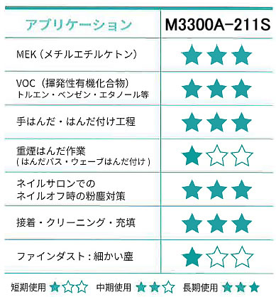 | 小さなボディで有機溶剤(MEK)成分を閉じ込めニオイを取り除く 作業能力UPと作業者の健康を守る、現場の揮発性有機化合物'VOC)対策に フィルター警告機能付き、電子フィルター制御 軽量小型で持ち運び自在 マルチ電源対応100-240V 高容量ガスフィルター ![]() ■パーティクル及びガスフィルター容量に基づいて選定ガイド ![]() ■ポイント 産業用インクジェットプリンターに使用されるインクに含まれる「アセトン」や「メチルエチルケトン(MEK)」は有機則(有機溶剤中毒予防規則)の対象となり、印刷・印字の作業現場において有害物質の吸入の予防対策が必要になります。 M3300A-211Sなら、有機溶剤(MEK)にも滞欧。嫌なニオイも取り除きます。 ■テクニカルデータ