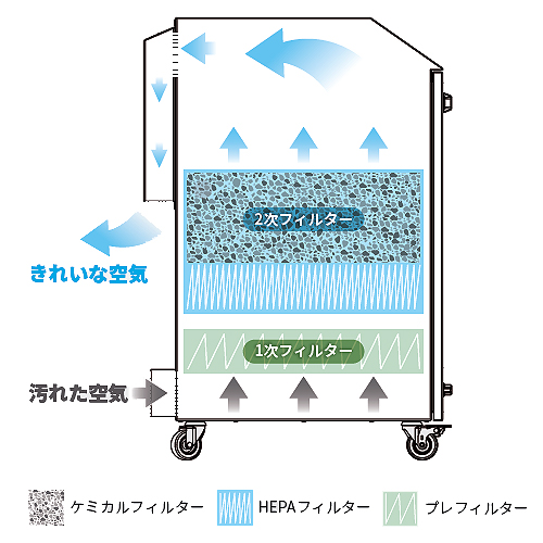 | コンパクトなボディで人体に有害な揮発性有機化物(VOC)成分を効率的に除去&脱臭 人体に有害な成分を活性炭とHEPAフィルターにより吸着クリーンな空気にして排出。 ![]() ■特長 ●HEPAと活性炭を組み合わせたフィルター 大容量活性炭フィルターでMEK・VOC(揮発性有機化合物)を吸着。有機溶剤の揮発成分が引き起こす健康被害(吐き気・頭痛・倦怠感)の対策に ●自動流量制御 ●液晶画面搭載でフィルター状態をリアルタイムで確認可能 ●安全運転 2つの温度センサーにより、本体とフィルターの熱上昇を防ぎます ●自動流量制御 ●USB(最大4GB)を接続すると、使用状況が分かるデータをダウンロードできます。 ●安全運転 2つの温度センサーにより、本体とフィルターの熱上昇を防ぎます ●操作は電源のON/OFFと流量調整のみ ●メンテナンスはフィルター交換のみ ●環境に配慮した循環型フィルター 再生可能なフィルターリサイクルシステム ●ダクト工事が不要・簡単設置・移動がラク ●低コストで有機則対策 ●リバースフローエアフィルター技術(RFA) ●先進カーボンフィルター技術(ACF) ●オートセンシング電圧(100V~24V)のグローバル用 ●低騒音レベル ●ロック可能なキャスター付 ■2つの高性能フィルターが揮発性有機化合物(VOC)成分を除去。細か い塵・ニオイまで逃さない。 揮発した有機溶剤(VOC)を活性炭とHEPAフィルタにより吸着し、クリーンな空気にして排出。 工場内の有害物質の吸引を防ぐだけでなく、イヤな臭いも取り除き、吐き気・頭痛・倦怠感などの健康被害から作業員を守ります。 ![]() ■用途・使用例 ●有機溶剤使用現場・作業場の環境改善対策に最適 ●トルエン・キシレン・酢酸エチル・IPA・MEKなど、その他多くの有機溶剤使用現場の環境改善実績多数 ●接着工程・洗浄工程・インクジェット印刷現場 ●パッド印刷機使用現場・樹脂/ゴム成型現場等多数の実績 ■各部名称 ![]() ■仕様