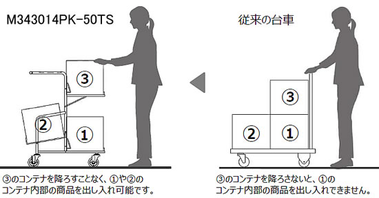 コンテナ3個横積みピッキング台車(テーブル付) 品番 M343014PK-50TS 価格は下記をご覧ください |