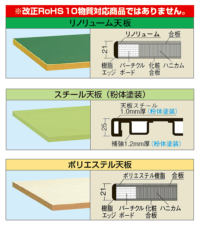 | 本体は角パイプ(構造用鋼管)を使用しているため非常に堅牢でしかもホコリが溜まりません。 本体折りタタミ機構により不要時コンパクトに収納できます。 ![]() ![]() ■天板仕様 ![]() ■タイプ