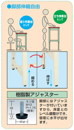 | 様々な作業現場に活躍するコロボール内蔵の作業台が新登場! 製品搬入の補助や荷物の積み降しに。 ![]() ■脚部には目盛り付! ![]() ※脚部には目盛り が入っているので、調整が簡単に行えます。 ■ポリエステル天板 ![]() ■脚部伸縮自由 ![]() ■使用例 ![]() ■タイプ