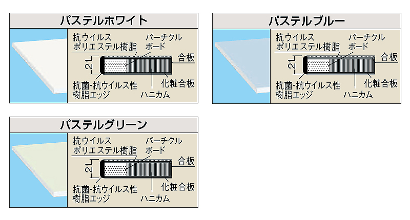 | ■特長 ●抗ウイルス効果のあるパステル色の天板を使用した作業台です。 ●本体は銀イオンを配合した抗菌効果のある粉体塗装を採用。 ●高さ(座り作業用)H740 mm ●本体は角パイプ(構造用鋼管)を使用している為、非常に堅牢でホコリが溜まりません。 ![]() ![]() ■天板仕様 ●ホワイト 清潔などのイメージを想起させる白はどんな色とも合う事が最大の特長です。また、気分を一新させる効果があります。 ●ブルー 冷静さや爽快感を感じさせる色です。 脈拍や呼吸数を減少させ、鎮静の効果もあります。 ●グリーン 安心感や情緒の安定、緊張の緩和効果を与えます。また、開放的で精神的にも疲れを癒し、リラックスさせる効果もあります。 ![]() ![]() ■タイプ