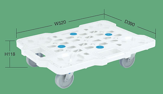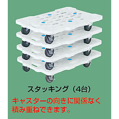 | メッシュ構造の超軽量平台車に新色が登場。 連結・スタッキングも可能です。 均等積載荷重:100kg ●荷台面にはスベリ止めを4個配置 ●キャスターは、ボルトレス構造で安心・安全。 ![]() ■ボルトレスで安心・安全 ●組付け方 ![]() ![]() ■軽量仕様 メッシュ構造によって、さらなる軽量化を実現。 質量:1.84kg ![]() ■取手 取手は楕円型でにぎりやすい形状 (長手方向・短手方向各1ケ所) ![]() ■スタッキング・連結可能です。 連結した状態でのスタッキングはできません。 ![]() ■キャスターの向きに関係なく積み重ねできます。 ![]() ■キャスター キャスターは、エラストマー車・ナイロン車の2種類を用意しました。 ※キャスターにストッパーはありません。 ![]() ![]() ■寸法図