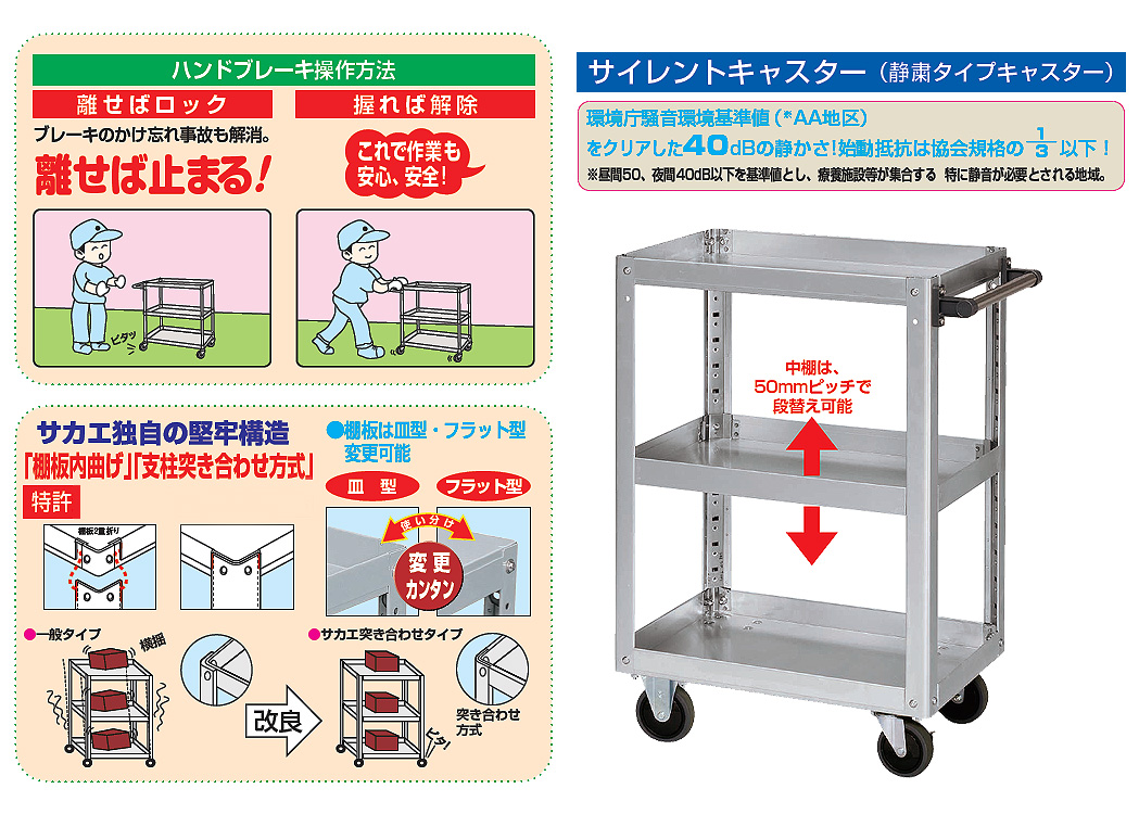 ●キレイ 軽い 衛生的 見た目にも美しいアルミ製のワゴンです。 ●サイレントキャスター(静粛タイプキャスター) ●環境庁騒音環境基準値(※AA地区)をクリアした40dBの静かさ!始動抵抗は協会規格の1/3以下 ※昼間50、夜間40dB以下を基準値とし、療養施設等が集合する 特に静音が必要とされる地域。 ![]() ■寸法図