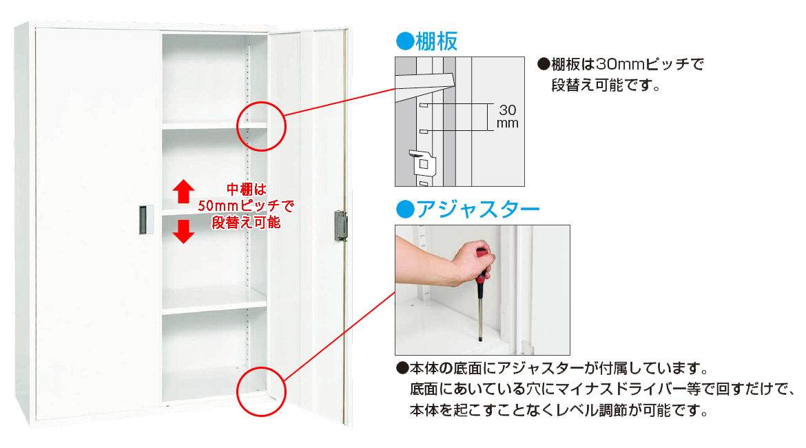 | 銀イオン配合による抗菌効果のある粉体塗装を採用。 間口1200mmの幅広工具管理ユニット。 今まで収納が難しかった大型工具も効率良く収納できます。 改正RoHS10物質対応 ![]() ■特長 <M350Uシリーズ> ●棚板は30mmピッチで段替え可能です。 ●本体の底面にアジャスターが付属しています。底面にあいている穴にマイナスドライバー等で回すだけで、本体を起こすことなくレベル調節が可能です。 ![]() <M350THシリーズ> ●M350THシリーズは奥行の広い(750mm)の保管庫です。 ●棚受け部は通常の保管庫と違い、ビーム全体で棚板を支えている為、たわみに強く安定して物を置くことができます。 ![]() ●アジャスター 樹脂製アジャスター付、ネジ径M12×P1.75、耐震固定金具使用可 ![]() ■タイプ