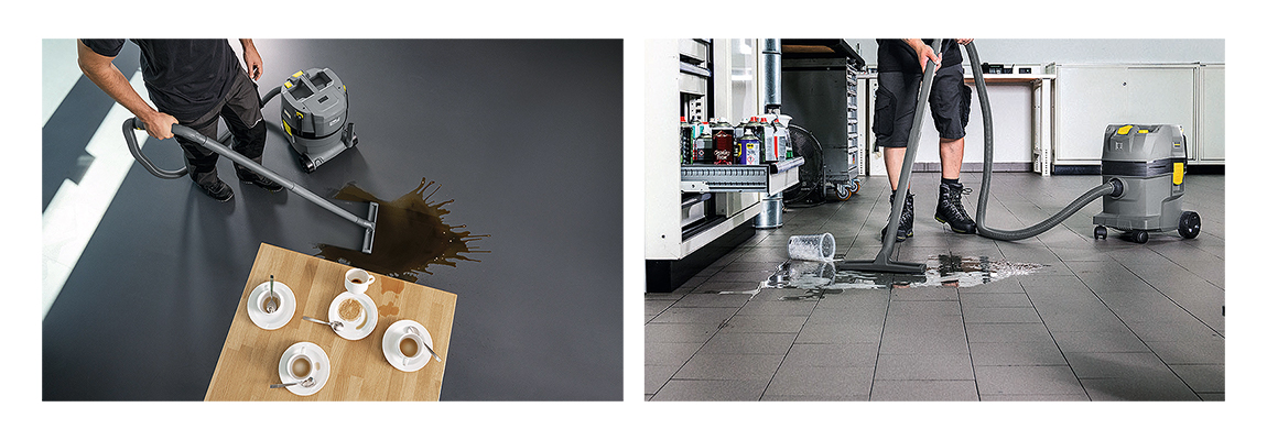 外部電源のない場所で、吸引力が必要な時に活用できる、業務用コードレス乾湿両用クリーナーです。 |