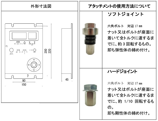 | 小型インパクトツールの日常点検に。 表示部にLEDを採用しているので暗い場所でもはっきり数値が読み取れます。 一体型でコンパクトなので場所を選ばず測定できます。 ![]() ■主な機能 ●最大25N・mまで測定可能 ●インパクトツール用の打撃数カウンタ搭載 ●ソケットを付けた状態で測定可能 ●ソフトジョイント(弾性体締め付け)とハードジョイント(剛性体締め付け)添付 ●データ取り込みソフト無償ダウンロード可能 ●表示部にLEDを採用。暗い場所でもはっきり数値が読み取れます。 ●5分間放置後、電源が自動的にオフされます。(オートパワーオフ) ●バッテリー駆動なので場所を選ばず使用でき、現場への持ち運びに便利 ●測定値を設定時間で自動的に表示ゼロクリアします。(0.5~3 秒の間で設定可能) ■使用例