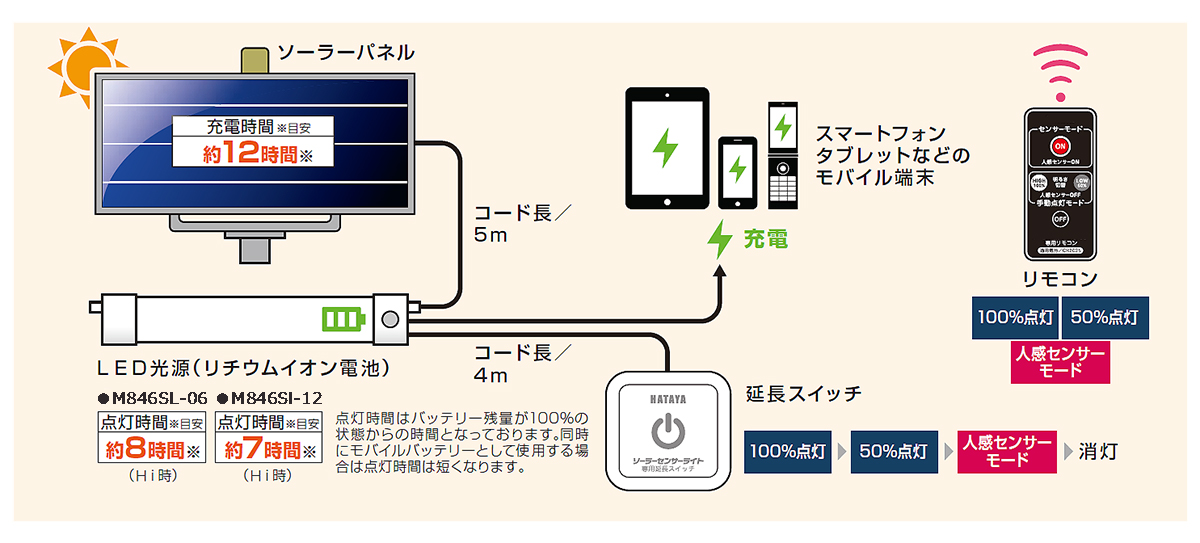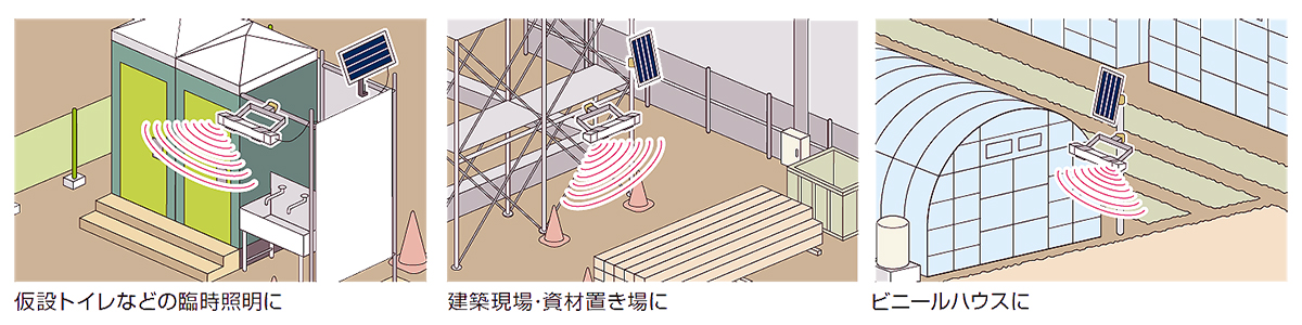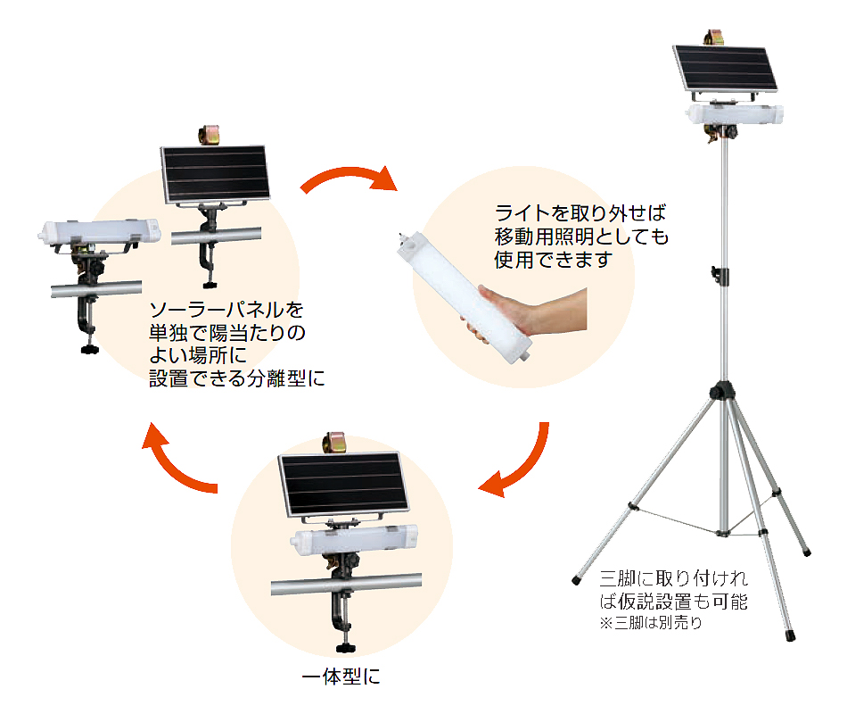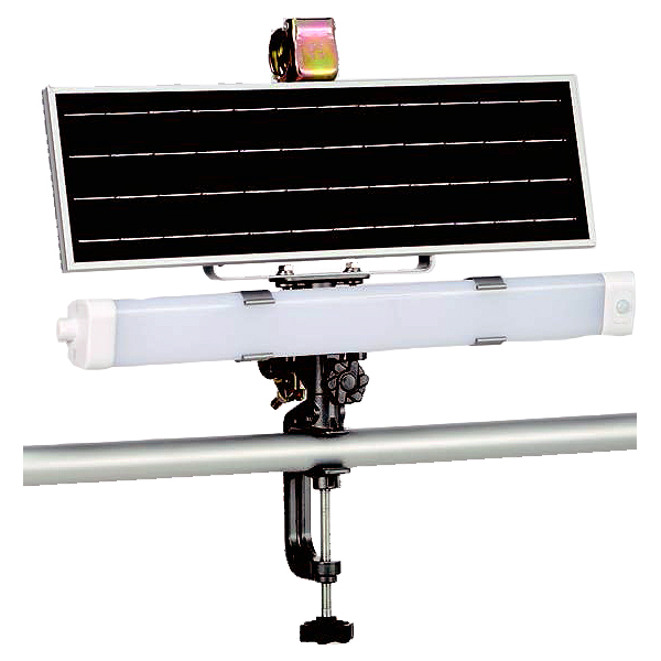 ■特長 ●電源が取れない場所でもソーラーパネルで充電可能 ●灯体は工具不要で取り外せ、移動用照明としても使用可能 ●人感センサーモードで動作検知時のみ点灯し省エネ ![]() ●3WAYの取付け方法 (バイス・単管クランプ・三脚) ![]() バイスと単管クランプ(φ48.6)は製品に標準付属 リモコン・延長スイッチ付属で離れた場所からでも操作可能 ![]() 灯体とソーラーパネルはドッキングして一体型で使用可能。灯体だけを取り外して設備点検や非常時の照明としても使用できます。 ![]() ●スッキリ収納できるケーブル収納アーム付 ![]() ●USBポート出力(5V/最大1A)ができるのでスマートフォンなどの充電が可能 (水がかかる場所でのUSBポートの使用はできません) ![]() ■使用例 ●無人パーキングの自動照明、防犯対策に。 ●資材置き場や無人倉庫の防犯、省エネ対策に。 ●学校や公共施設、店舗などの防犯対策に。 ●果樹園、ビニールハウスなどの防犯対策に。 ●アパート・マンション内駐車場や駐輪場の夜間防犯対策に。 ●居住者帰宅時の暗い道の導線確保に。 ![]() ■仕様