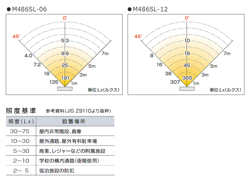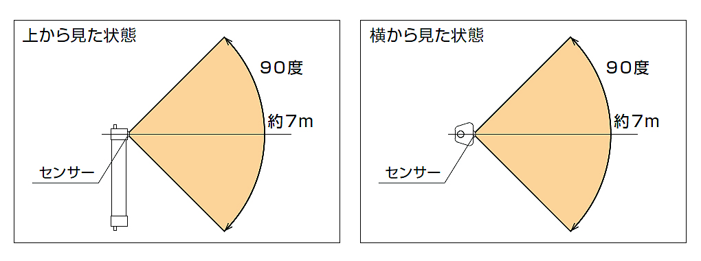 ※点灯時間と充電時間は取付環境や天候等の条件により大きく変化することがあるので目安としてください。 ※本製品のセンサーは動作明るさの設定はできません。 ■照度表 ![]() ■使用方法 ※点灯時間と充電時間は取り付け環境や天候等の条件により大きく変化することがあるので目安としてください。 ![]() ■センサー検知範囲 |