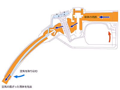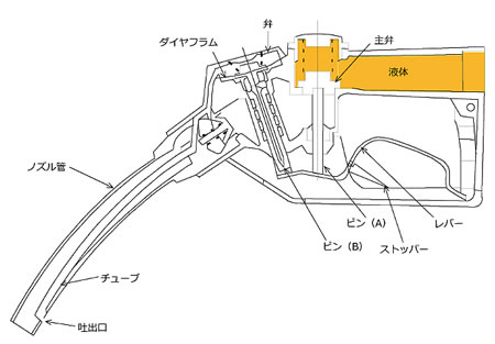 ◎電気・電池などを使用せずストップ 電気や電池を使用せず、満タンになれば液面感知で自動ストップするしくみのノズルです。 一定の流量と圧力でオートストップが機能するため、自重落下では使用できません。 ※使用圧力と流量範囲にご注意ください。 ※流量計には電池を使用しています。 《メリット》 ●手元で楽々、簡単操作 ●満タンになれば自動ストップ ●液体の管理でコスト削減 《特徴》 ●握れば吐出、離せば止まる ●レバー引っ掛け付 ●流量計付 ●自然落下、サイフォンの利用では使用不可 <尿素SCRシステムについて> ![]() ■主な内部構造 ![]() ■2.使用時の状態 ①レバーを引き上げるとピン(A)が上がり、弁が押し上げられ流路が開きます。 ②ノズルの検知部を押し開けて吐出されます。 ![]() ■オートストップ作動構造 容器内の液や泡が吸入口を塞ぐと内部構造により自動的にレバーが戻り、液が止まります。 ![]()