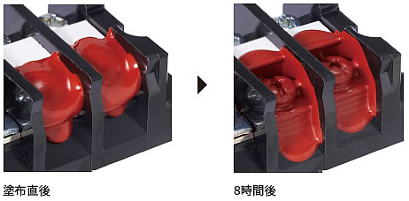 | 端子台の錆・粉塵によるトラブルでお困りではありませんか? 耐水性、耐透水性、電気絶縁性に優れたゴム系高分子材料を溶剤に溶解したコーティング材料です。 ![]() ■解体可能型 施工後に溶剤が揮発し、柔らかいコーティング層を形成するため、テスターを強く押しあてれば、通電を確認することもできます。 ■錆の発生を抑える シリコーンゴムに比べて、約1000倍のガスバリア性があり、空気・水を通し難いため、塩害等による錆の発生を抑えます。 ■硬化機構 ![]() ![]() 形成された皮膜は、水・水蒸気・空気をほとんど通さず、解体ができる絶縁性の皮膜です。 ■ベンガラ色を使用した場合の硬化例 ![]() ■使用現場例 ![]() ■製品用途 ●屋内600V以下の端子台の絶縁・防食 ● ボルト締め接続など各種屋内接続部の絶縁・防食 ■乾燥後の塗膜特性