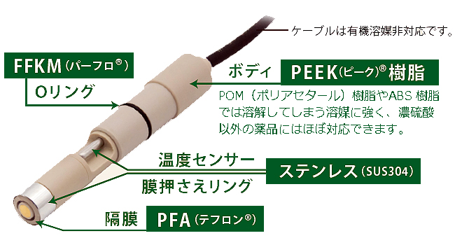 ※溶媒の種類に加え、 測定水の条件(水温、粘度、量など)がありますので、確認事項表にご記入の上ご返送ください。 ※耐溶媒(溶剤)性のある材質を使用しておりますが、長時間浸けたままにしない、使用後は溶媒を拭き取る、などの取扱上の注意をお願いしております。 ■主な用途 ●有機溶媒の研究・開発、脱気状態の管理 ●有機溶媒を含んだ製品の酸素による劣化や変色などの検証・品質管理 など ■仕様