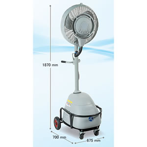 ハードプロユースに適した遠心分離式ミストファン ノズル不要、タンクガード、一点吊フック、大型車輪 現場での熱中症対策に |