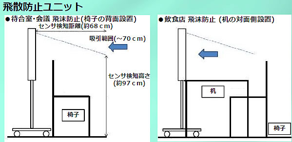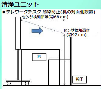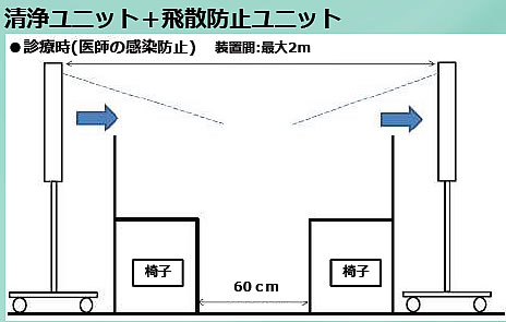 | コンパクトで省スペース、分割式で多用途に使える。 【クリーンパーテーションとは】 パーテーションを兼ねた、薄型空気清浄機(高性能HEPAフィルター搭載)です。 クリーンエアーを吹き出す「清浄ユニット」と、汚染エアーを集塵する 「飛散防止ユニット」があり、2種類を組み合わせて使用したり(PUSH-PULL) 用途に応じて、それぞれを単独使用して、ウイルス対策にお役立ちします。 ![]() ■特長 ①コンパクトサイズで省スペースのため、個人クリニックに最適です。 ②上下(本体+キャスターユニット)分割式のため、狭い搬入口でも搬入・設置が出来ます。 また本体ユニットのみでのご使用も可能です(机・台への据置) ③センサーによる自動運転のため、装置に触れることなく衛生的です。 また人がいない時は運転しないため、省エネです。 ④風量調整が付いているため、設置場所に応じた風量・騒音値調整が可能です。 ⑤オプションで除菌酵素HEPAフィルタへの変更が出来ます。 ※除菌酵素HEPAフィルタとは? :細菌等を捕集するだけでなく、除菌まで可能な特殊仕様です。 ⑥側面吸気⇒前面排気、側面排気⇒前面吸気仕様のため、壁付け設置が可能で、省スペースです。 ■使用方法 ![]() ![]() ![]() ■ミーティングスペース設置例 ![]() ■仕様