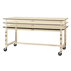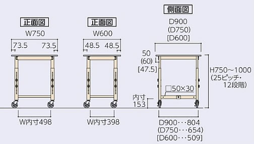 | 物を載せたままの移動は、落下の恐れがあり危険です。 又、床の段差を無理に乗り越えると破損や変形の危険があります。 高さが変えられてしかも移動式。 H750mm~H1000mm 25mmピッチで高さを調整できます。 ![]() ■25mmピッチで高さを調整できます。 ![]() ■ノブ8個により、工具なしで高さを変えることができます。 ピッチ25mm、調整範囲250mm ![]() ■キャビネット 引出率100%の使いやすいキャビネットです。 ( )内は引出し内寸法(単位mm)を示します。 ![]() ![]()