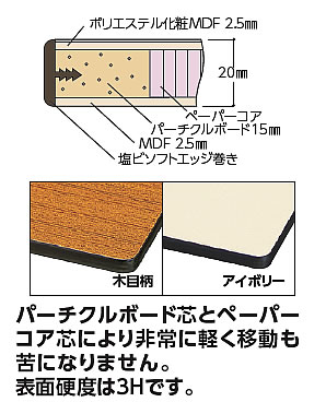 | ■特長 ●スムーズに移動できるポリエステル天板のワークテーブルです。 ●座り作業用に最適な高さ740mmと、立ち作業用に最適な高さ900mm。 ![]() ●キャスターは4輪とも自在ストッパー付きで軽快です。 ■天板 ![]() <注意> 物を載せたままの移動は、落下の恐れがあり危険です。 又、床の段差を無理に乗り越えると破損や変形の危険があります。 ■寸法図 ![]() ![]() ![]() ■ポリエステル天板(20mm)