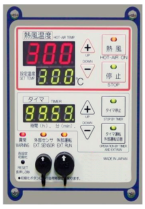 オプションの専用外部センサを使用し、設定した温度により送風とヒータを同時停止して、指示された温度まで運転停止状態を維持する省エネモードを装備しています。部運転による熱風運転時においても、間欠運転は使用できます。