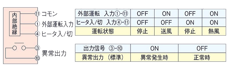 外部運転機能:外部からの信号により、熱風乾燥機の停止 ⇔ 送風運転 ⇔ 熱風運転の切り替えができます。
