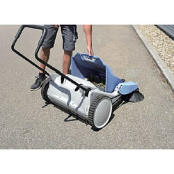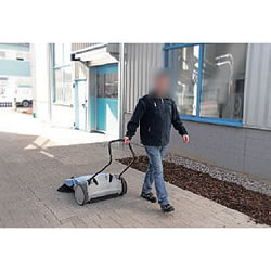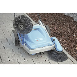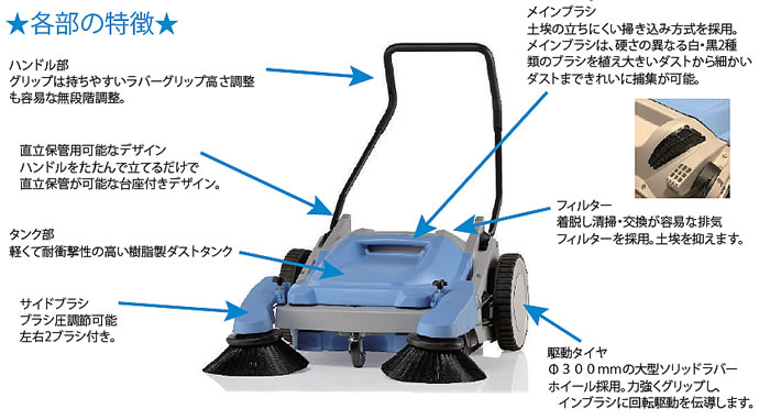 | ●ドイツクランツレの工場にて、ボデイ・部品の成型・組み立て全て行う生粋のドイツ製スイーパーです。 ●ホウキでは埃が舞い掃除が難しい箇所も、飛散をある程度抑えて清掃も可能。 手押しなので電力不要。 ●推進機材として、倉庫、エントランス、工場、通路、出荷場、軒下、駐車場等の清掃に最適です。 ![]() ![]() ![]() ■左右どちら側からも壁際の清掃が可能なサイドブラシ 高さ調節可能なサイドブラシが左右2本標準装備。 どちら側からも壁際のダストを掃きだしメインブラシで回収出来るようにします。 またお使いにならないときには上にあげることでブラシの消耗を簡単に回避できます。 ![]() ■良好なダスト捕集性能 駆動用の車輪が多きくグリップ力が強いのでメインブラシは非常に軽く回転します。 また、メインブラシは柔らかい毛で細かいダストを、硬い毛で粗いダストを効率よく回収します。 ![]() ■使用箇所の近くに場所を取らず立てて保管が可能 簡単にハンドルをたたんで場所を取らないよう自立するようにしました。 ダストタンクもピタリとはまるため立てても倒れません。 ご使用箇所に近いところに省スペースで保管が出来ます。 ![]() ■引っ張り移動することで、軽く清掃箇所まで手軽に運搬可能 本機を引っ張るとブラシは回らず、非常に軽く移動が出来ます。 手軽に清掃箇所まで本体を移動させすぐにご使用頂けます。 ![]() ■軽くてダストの廃棄が容易なダストタンク 耐衝撃軽量樹脂製ダストタンク採用。軽くて割れにくく丈夫なダストタンクです。 タンクの中にダストを残さず簡単に廃棄できるように背面を注ぎ口のような形状にしました。 ![]() ■注意 製品の使用に際しては、梱包の中にある取扱説明書を習熟してから、正しくお使い下さい。 |