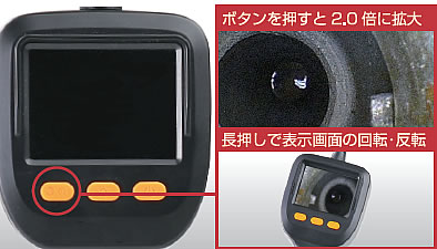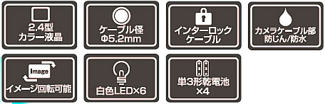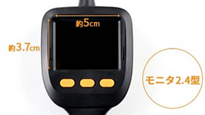 | シンプルな機能で一般家庭での使用から業務まで幅広く使用できる超低価格内視鏡です。 先端部外形φ5.2mmの細径で隙間や配管の中を2.4型のモニタで確認できます。 有効長1mのケーブルでバリやキズを見逃さない。 ![]() 自由自在に形を変えられるインターロックケーブル 有効長1mのスネークカメラのケーブルはインターロックケーブルを採用。 思い通りの形に形状を記憶します。曲がった配管や高い場所の点検に便利です。 ![]() ![]() ■細径5.2mmのケーブルが目視できない内部の様子を映し出します 日常生活で隙間や奥の方を覗いてみたいときはありませんか? 家具の隙間やエアコンクリーニング時の内部確認、床下、機械のメンテナンスや、DIYなど、直接見ることが難しい奥の方を極細径のカメラで映像化します。 目では確認できない狭い場所や高い場所など、極細の径が奥まで入り込みモニタに映し出します。 ![]() ■IP67の防水性能で水回りの点検が可能 排水溝などの水回りの汚れの点検に、IP67の防水・防じん性能の内視鏡ならほこりの多いエアコン内部や床下、水気のある排水溝などの点検にも安心して使用することができます。 IP67とは 水の浸入に対する保護等級7:規定の圧力、時間で水中に浸漬しても 有害な影響を受けない。 人体および固形物に対する保護等級6:粉塵が内部に侵入しない。 ![]() ■シンプルな機能でコストを抑え超低価格を実現 「映像を見る」ことにフォーカスしたシンプルな機能を搭載。 デバイスを用意する必要がないモニタ一体型で誰でも簡単に使用することができ、一般家庭でも手が届きやすい価格を実現しました。 ![]() ■イメージ拡大/回転機能 本体左側にある拡大/回転のボタンを押すたびに、デジタルズームで最大2.0倍まで拡大表示されます。また、ボタンを長押ししすることで表示画面の回転・反転します。 ![]() ■LEDライトを搭載 ケーブル最短に搭載された6灯のLEDライトは5段階の調光が可能です。 使用場所に合わせてお好みの明るさで観察・点検できます。 明るすぎず、暗すぎないちょうどいい明るさに設定して点検することができます。 ![]() ■しっかり確認できる2.4インチモニタ 2.4インチモニタを搭載したモニタ一体型の内視鏡はタブレットやスマートフォンを使用せずにこの一台で見ることができます。 映像を見る際には便利なデジタルズームやイメージ回転機能などをボタン1つで操作することができます。 ![]() ■便利なカメラアクセサリ付き 直視では見えない映像をキャッチするミラー、ネジや小さな金属をキャッチするマグネット、ケーブルなどを付属しております。 ![]() ■IP67の防じん、防水性能 IP67の防じん・防水性能を搭載。ほこりの多いエアコン内部や床下、水気のある排水溝などの点検にも安心して使用する事が出来ます。 ![]() ■快適な点検をサポートするデジタルズーム・映像回転機能 さらに詳細を見たいときはボタン1つで1.5倍→2倍にズームが可能です。 また、ケーブルを操作せずにワンタッチでモニタの映像を回転。快適な点検をサポートします。 ■約7時間使用できる電池式内視鏡 単3形アルカリ乾電池4本だけで約7時間もの間使用することができます。 また充電池を使用することもできるので、買い替えが面倒な方は充電池の使用がおすすめです。 ※乾電池は付属しておりません ■仕様