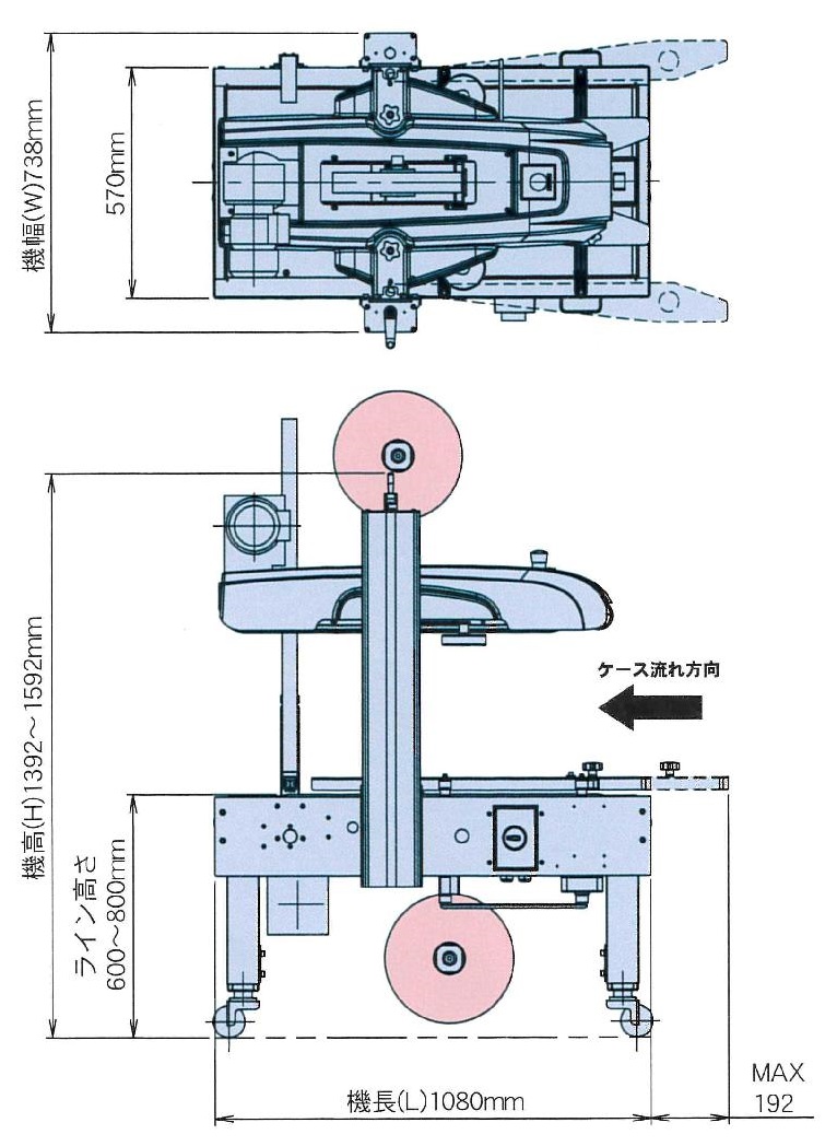 | ■特長 ●幅広の上下ベルトでケースをしっかり搬送。重量物(~20kg)や背の高いケースも確実にシーリング出来ます。 ●ハンドル操作で簡単にサイズ調整が行えます。 ●欧州機械指令「2006/42/EC」に適応した設計です。非常停止ボタン・上ベルト駆動部にカバーを標準装備し安全性を向上しました。 ●逆仕様への変更も可能です。 ![]() ![]() ■寸法図 ![]() ■仕様