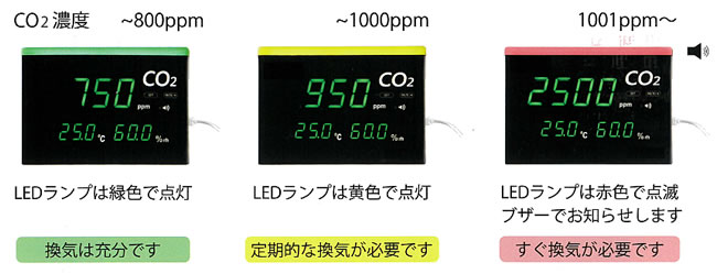 | 換気タイミングを分かりやすくお知らせ 換気の必要性 換気の悪い密閉空間では感染症のクラスター発生のリスクが高くなると言われています。 CO2(二酸化炭素)濃度の測定は多人数が利用する空間における不十分な換気を明らかにするために効果的な方法です。 ![]() ■特徴 ●換気タイミングをお知らせ CO2濃度に応じて、LEDランプが3段階で変化し、ブザーを鳴らします。 換気タイミングの目安を的確にお知らせします。 ●校正機能付きCO2センサ 外気を利用したCO2センサの校正機能付き。長期間、安定してご使用いただけます。 ※CO2濃度を測定するセンサには、他のガスの影響を受けにくく、センサ寿命が長い非分散型赤外線式ガスセンサ(NDIRセンサ)を採用。 ■使用場所例 学校・各種施設、飲食店、オフィス・会議室、ビニールハウスなど ■換気タイミングをLEDランプとブザーでお知らせします。 ![]() ※LEDランプを黄色、または赤色に変更するCO2濃度の値(ppm)は、自由に設定できます。 ![]() ![]() ■仕様
