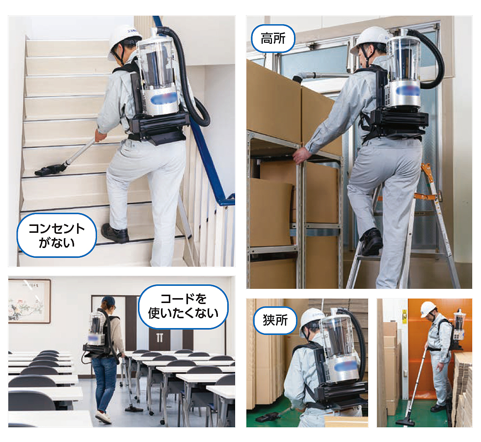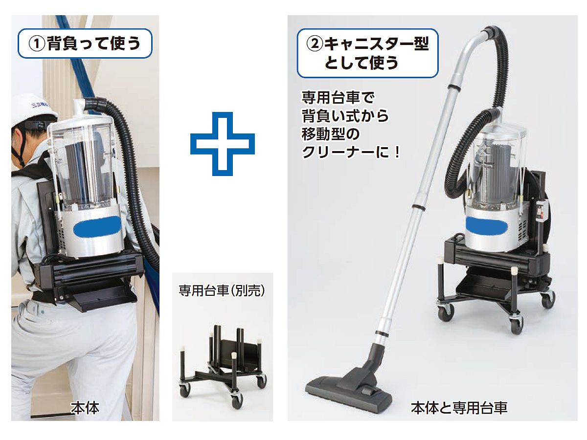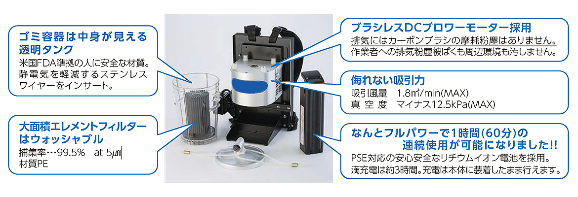 | フルパワー運転、60分間使える 電池で動くコードレスの背負い式バキュームクリーナー ![]() ■特長 ![]() ●2Wayで使える! ![]() ●片づけるとき、専用台車(別売り)にホースやアタッチメントを収納できます。 ![]() ■使用場所 ●電源コンセントがない。電源コードを使いたくない、使えない。 階段(工場/作業場・倉庫・オフィスビル・駅・空港等)、人通りの多い場所(駅構内・スーパー・コンビニ・デパート) ●狭い場所 店舗、会議室、映画館、コンサートホール、競技場、美術・博物館等のバックード、車両(電車・バス・航空機・船室)、製造工場の機械室や機械周辺 ●高い場所 工場の高所、倉庫棚、天井クレーン、現場事務所、仏閣の仏像、博物館の展示物 ![]() ■アタッチメント ![]() ■仕様