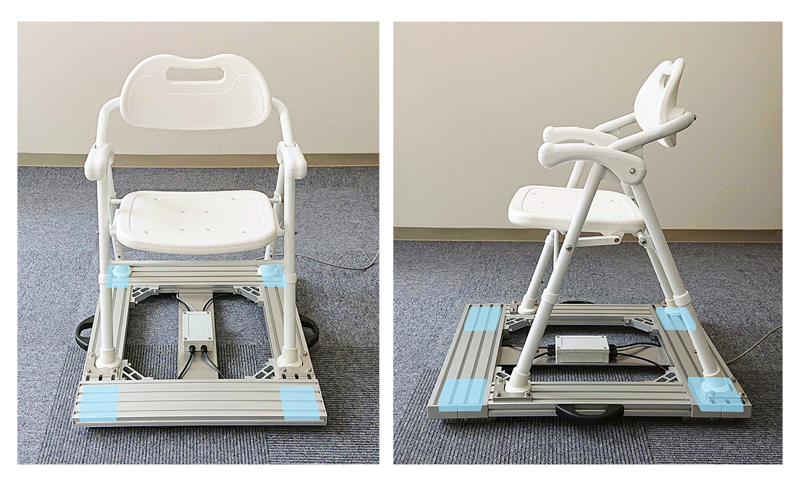 ※専用アプリは送信機に対して1対1接続のみです。 ●大型のサイズも対応可能ですので、ご相談ください ![]() ●オプションで金具付きに 使用する場所にはかりを固定する金具付きオプションも選択可。(後付けは不可となります) ![]() ■使用例 様々な形状の物に組み込むことで無限にオリジナルの計量器を作ることが可能な製品です。 ●超小型サイズは大物計量も得意。計量パーツとして足に敷くだけで測れます。 ![]() ●椅子型 MC47TX11-D50KG-4S(超小型サイズ/110mm□×23mmH)を台座の四隅に組み込み、座ってはかれる体重計。 ![]() ■仕様 ●はかりと表示機のセット