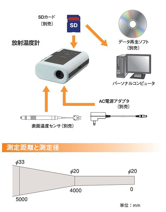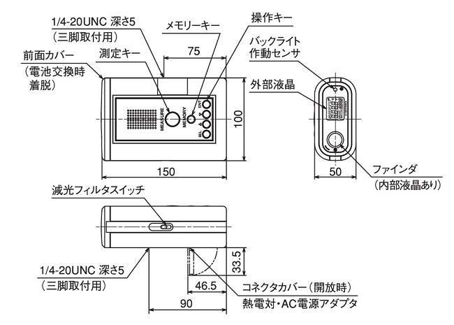 | 携帯形放射温度計 耐環境性・堅牢性を向上し、様々な現場での計測に対応 ![]() ■特長 ●小形・軽量で握りやすく操作しやすい形状 ●本体後部の表示部およびファインダ内に測定値表示 ●直視ファインダに減光フィルタを内蔵し、高温の測定対象を視認可能 ●熱電対入力を搭載し、熱電対指示に合せた放射率設定が可能 ●SDカード(別売)搭載によりデータの管理が簡単 ![]() ■寸法図 ![]() ■仕様