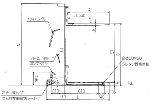 ※荷物の重さによって上昇ピッチが自動的に切り替る油圧式の早送り装置付き。 積載荷重の20%の荷重で自動的に切り替わります。