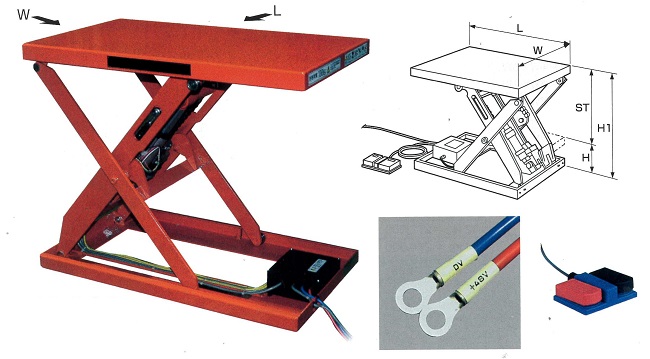 コンパクト、省スペースAGVなどに搭載しやすい場所を選ばないタイプです。![]() ■おもな特長 ●ブラシレスモーター使用 ●ベクトル制御 ●ドライシリンダー ●ユニット内蔵 ●最大起動頻度10回/分 ●ジャバラ式フルカバー(Jタイプ) ●LED付フットスイッチ コード:2m ●上限・下限リミットスイッチ付(モーター出力0.4kw) ●上限・下限リードスイッチ式(モーター出力0.07kw) ●電源コード:2m ●最大使用回数4万回 ●粉体塗装 注)テーブル側方からの積載時:W側から1/2、L側からは1/4の積載荷重(表中)以下で行って下さい。 注)テーブル上で溶接作業はしないで下さい。 ![]() ■仕様(単位指定がない場合:mm)