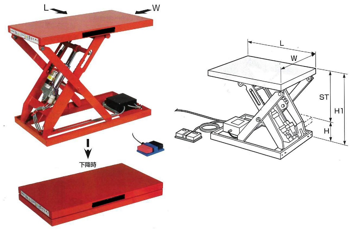 コンパクト、省スペースその上、薄さまで兼ね備えた、場所を選ばないタイプ。![]() ■おもな特長 ●ブラシレスモーター使用 ●ベクトル制御 ●ドライシリンダー ●ユニット内蔵 ●電源:単相100V ●最大起動頻度10回/分 ●ジャバラ式フルカバー(末尾にJ) ●LED付フットスイッチ コード:2m ●上限・下限リードスイッチ付 ●電源コード:3m ●最大使用回数4万回 ●粉体塗装 注)テーブル側方からの積載時:W側からは1/2、L側からは1/4の積載荷重(表中)以下で行って下さい。 注)テーブル上で溶接作業はしないで下さい。 ![]() ■仕様 (単位:mm)