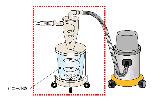 <トランスファーリッド(サイクロン式)/SAS-SIC> ●吸引する対象物が大量の固形物の場合、トランスファーリッド(サイクロン式)の併用をお勧めします。 ●紛体・固形物を200ℓオープンドラム缶に回収することができます。 ●トランスファーリッドをドラム缶に載せるだけです。 ●回収ホースは38φ、50φ、75φのいずれかを選択でいます。 ![]()