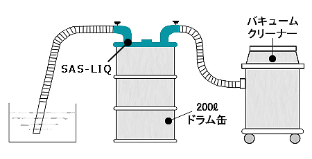 <トランスファーリッド(標準式)/SAS-LIQ> ●回収物が大量の液体で中に固形物が含まれている場合、トランスファーリッド(標準式)の併用をお勧めします。 ●水・油などの液体を200Lオープンドラム缶に回収することができます。 ●トランスファーリッドをドラム缶に載せるだけです。 ●回収ホースは38φ、50φ、75φのいずれかを選択でいます。 ![]()