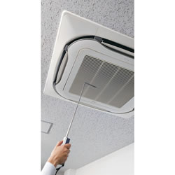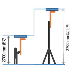 | 世界初!これまでなかったJIS規格適合の「ワイヤレス風速計」 SpiderPlus(スパイダープラス)、CheX(チェクロス)の風量測定機能に対応。 ![]() 目盛り付きのI・L 型伸縮プローブ ストレートにもL 型にも固定することができる最大外径9mmの目盛り付きプローブはダクト内の計測にも便利で、風速センサー部の挿入位置をmm 単位で確認できます。 海外規格のダクト測定口(3/8 インチ) にも挿入できます。 ![]() ■プローブ側にも操作ボタンを配置 計測値のホールドや計測の開始/停止などの基本操作を行うことができます。 また、LEDランプで通信状態やバッテリー残量などを確認することができます。 ■プローブ単体で天井高2700 mmまで計測可能 プローブは先端がL 型に曲がるだけでなく、伸縮式の延長棒が内蔵されていますので、プローブ単体で天井高2700mmまで計測することができます。 ※身長160cmの計測者を基準として算出しています。 ■さらに高所の計測にも プローブには標準の三脚取付穴(UNC1/4) が配置されていますので、市販の一脚や三脚を用いることで2700mmを超える高所の計測にも対応することができます。 ![]() ![]() ■使用例 ![]() ■高所の風速・風量計測に便利な延長棒。(MD7A-522AFSLT付属品) ![]() ![]() ■プローブ仕様