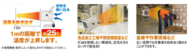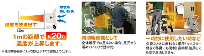 | 三相200V ラクラク移動 サーマルプロテクター付 ![]() ■タイプ別特長 ●ME1EN-211GN ![]() ・室内の空気を吸い込み、電熱線ヒーターの熱で温風にして吹き出し暖める電気ファンヒーター。クリーンな性質から、密閉した室内で使用することができます。 ・灯油やガスなどの燃焼系とは違い、火を使わないので空気の汚れの心配や燃焼系の暖房器のように頻繁に換気に必要がありません。 ・わずらわしい灯油の補給が不要です。 ![]() ●ME1EN-61GN ![]() ・室内の空気を吸い込み、電熱線ヒーターの熱で温風にして吹き出し暖める電気ファンヒーター。クリーンな性質から、密閉した室内で使用することができます。 ・わずらわしい灯油の補給が不要です。 ![]() ■仕様