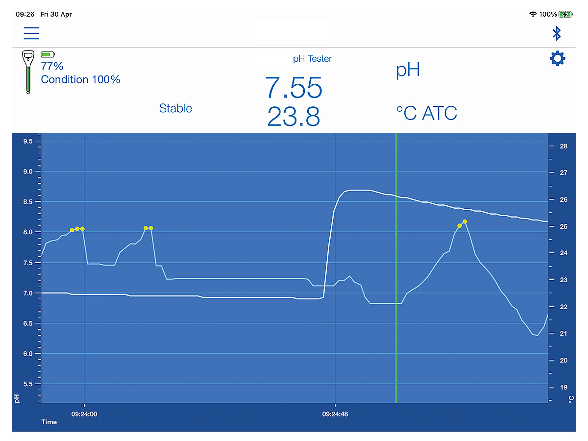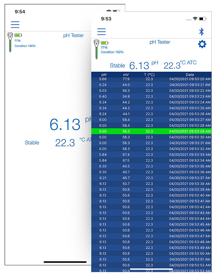 | Bluetoothを搭載し、お手元のスマートフォンやタブレットがpH計の早変わりします。 MF2PHN-9810402Hはラボや品質管理の測定に適したpH電極を採用。内部液がゲルなのでサンプルへの影響を抑えます。 また、液絡部の詰まりによる劣化を最小限に抑える構造です。 ![]() ■●4点校正が可能で、±0.02pHという測定精度! 小型のpHテスターとしては驚きの高精度の測定が可能です。 ●大学や企業で手動滴定を行っている方へ! 中和滴定におけるpHの変化/推移が一目でわかります。グラフ表示はもちろん、1秒ごとのデータも確認できます。 ●データの保存や転送も簡単! Bluetooth接続で無料の専用アプリを利用すれば、お手元のスマートフォンやタブレットの操作で簡単にデータ送信が行えます。 ●圧倒的なコストパフォーマンス! ポケットに入るサイズの従来のpHテスターとは一線を画すMF2PHN-9810412H。ラボ向けの専用電極を備えた本器はコストパフォーマンスも圧倒的です。 ●電極構造 分析や品質管理の測定に適したpH電極を採用。内部液はゲルタイプで非補充型です。 測定可能な温度は-5~80℃までと幅広く、高温にも対応。電極は増幅器を内蔵しておりノイズ誤差を防ぎ、かつ素早く安定した測定を可能にします。 ![]() ●手動滴定を行っている方にもオススメ 中和滴定におけるpHの変化/推移がグラフ表示はもちろん、1秒ごとのデータでも確認できます。大学や企業で手動滴定を行っている方にぴったりです。 ![]() ●お手元のスマートフォンやタブレットがpH計に早変わり 専用アプリはiOSとAndroidに対応。アプリをインストールしたスマートフォン/タブレットと本機をBluetooth接続すれば、お手元のスマートフォンやタブレットがpH計に早変わりします。 普段から馴染みのあるスマートフォンやタブレットなので直感的に操作でき、データのメール送信も簡単に行えます。(メール送信はCSVまたはPDF形式から選択可能) なお、アプリの利用に課金は一切ありません。 ![]() ●pH電極の状態表示&校正情報(GLP) 校正後のpH電極の状態を画面に表示。本来目に見えないpH電極の状態を把握しでき、メンテナンスや交換時期を適切に判断できます。初めての方にも安心の機能です! 校正情報(GLP)も充実。校正日時や標準液の種類、オフセット/スロープはもちろん、校正を行った標準液間のスロープも見れます。これにより、使用した標準液の汚染/劣化も把握でき便利です! ![]() ●3点校正まで可能(アプリ使用時は4点校正まで) ●初回分のpH標準液と電極洗浄液、電極保存液が付属。校正と測定後のメンテナンスに必要なものが付属していて安心です。 ●ボタン1つの簡単操作 ●ボタン電池1個(CR2032型)で約1000時間の継続使用が可能。(Bluetoothの使用だと約500時間) ■仕様
