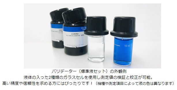 メーカー独自のバリデーター(標準液セット)を使うことで基準値内にあるかの検証と、許容範囲外の場合には校正が行えます。(校正とは本体の数値のズレを補正する機能)お客様ご自身でいつでも行えるため、常に高い精度と信頼性を保て安心です!