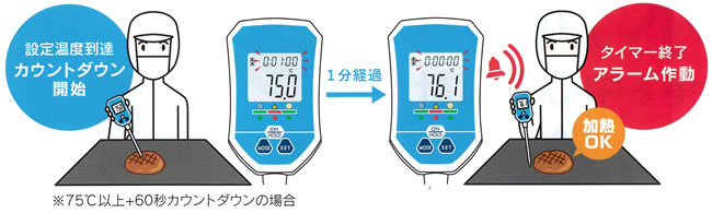| 水洗いできる中心温度計 測定温度範囲:最高250℃、最低-50℃ タイマー機能搭載 温度と時間を同時に測定 ![]() ■IP67、水洗いできる防水性能 IP67とは、水面から1mの深さに30分間水没させても、水の侵入がありません。 水洗いできるので衛生的にご利用いただけます。 ![]() ■3種類のタイマー搭載 ●設定温度以上になるとタイマーがスタートし、食材の加熱時間などをアラームをお知らせします。 75℃以上+60秒カウントダウン 食肉などに付着している有害な微生物の死滅は75℃で60秒以上の加熱が目安です。 ●85℃以上+90秒カウントダウン ノロウィルスの死滅は85℃で90秒以上の加熱が目安です。 ●任意温度上下限(-50~250℃)+任意カウントダウン(最大23:59:59) ご利用シーンに合わせた温度、タイマーの時間を設定できます。 ![]() ![]() ■マグネット内蔵 収納に便利なマグネットを本体背面に内蔵しています。 ![]() ■仕様