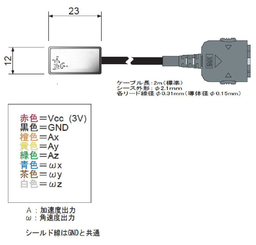 | スポーツのフォーム解析に最適!小型・軽量で動きを妨げない! アナログセンサーとして幅広い機器に接続可能! ![]() ■特長 ●3軸加速度センサと3軸ジャイロセンサをワンパッケージ化(6軸モーションセンサ) ●小型・軽量(W23×D12×H5、約3g) ●高さも低いため狭い場所にも取り付け可能 ![]() ![]() ■寸法図 ![]() ■共通仕様
