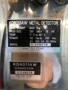 中古防水アンリツコンベア式金属探知機 品番 KD8013AW 問い合わせ番号 Z-0925-3 |