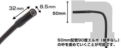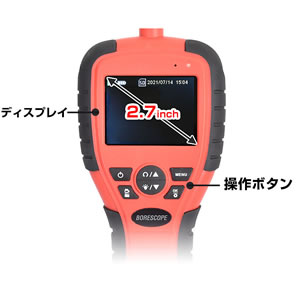 | アタッチメント3種付属、ケーブル径は3.9Φ。ベーシックな工業用内視鏡 先端径は3.9Φ。基本機能を揃えた工業用内視鏡です。 先端のカメラ部には6灯のLEDライトを搭載。 microSDカード(別売)への動画・静止画の保存が可能なので、リアルタイムに観覧する以外に、後から録画映像をチェックすることもできるので、便利に活用できます。 その他、側視ミラー・磁石・フックのアタッチメントが付属しています。 ![]() ![]() ■先端径3.9Φの内視鏡 ![]() ■カメラの先端径は3.9Φ。 先端に白色LEDライトが2個搭載されており、本体から3段階に明るさの調整が可能。 また3種類のアタッチメントが付属していますので、狭い配管内でも役に立ちます。 ![]() ![]() ■IP67防水機能 ![]() ■先端径8.5Φの内視鏡 カメラの先端径は8.5Φ。 先端に白色LEDライトが6個搭載されており、本体から3段階に明るさの調整が可能。 また3種類のアタッチメントが付属していますので、狭い配管内でも役に立ちます。 ![]() ![]() ![]() ■IP67防水機能 ![]() ■形状記憶型フレキシブルチューブ 自由自在に形を変えられる形状をキープできる ![]() ■さまざまな用途でご利用頂けます。 カメラのケーブルは、形状記憶型のフレキシブルチューブです。 お好みの形に調節が可能です。 隙間や配管にフィットし、細部の確認もスムーズに行うことができます。 ![]() ■2.7インチカラーディスプレイ搭載 本製品には2.7インチのカラーディスプレイを搭載。 画面を見ながら動画と音声、静止画の撮影ができ、microSDカード(別売)データを保存する事ができます。 その他180度の反転機能があるので、画面の上下を入れ替える事も可能です。 ![]() ■単三乾電池4本駆動 本製品は単三乾電池4本(別売)で稼働します。 ![]() ■寸法図 ![]() ■ケース ![]() ■タイプ