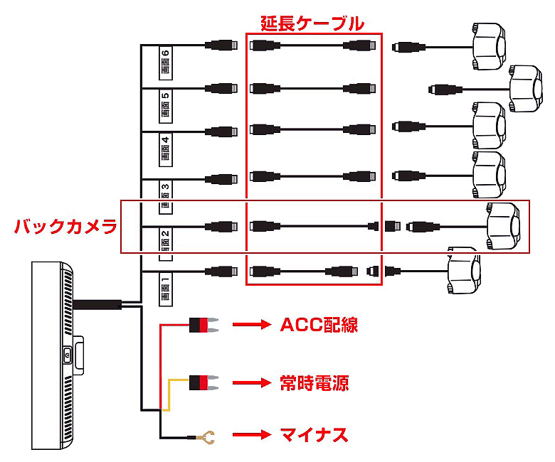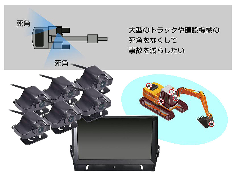 | 死角モニターにもなる48V対応6カメラ大型モニター付ドライブレコーダー 6つのカメラで、死角のできやすい大型トラックや建設機械の周りをくまなくモニタリング・撮影できるドライブレコーダーです。 ![]() ■特長 ●11インチの大型モニターで6カメラを同時に映すことが可能。 目視だけではカバーできない重機の死角をなくし、接触事故を未然に防ぐサポートをします。 15m、5m、3mの延長ケーブルが付属しているので、大型車両の後方にもカメラを取り付けることができます。 ![]() ●6個のカメラで車体の周りをカバー M1080SK-6BSRは6つのカメラで同時に撮影。カメラはそれぞれ視野角140度あるので、直接見て確認できない場所も運転席のモニターで確認することができます。 ![]() ●解像度720P 256GBまでのmicroSDカード使用可能 本製品は解像度1280×720、25fpsで撮影します。 microSDカード2枚にそれぞれ3つのカメラ映像が保存されます。コーデックは高圧縮・高画質のH.264で鮮明な映像になります。 保存された動画はmicroSDカードの容量を超えると、古いデータから上書き保存しますが、 microSDカードは最大256GBまで使用可能なので、microSDカードを交換することなく長時間連続撮影することができます。 ●リモコン操作/リバースライン ドライブレコーダーの操作は全てリモコンでおこないます。体を動かさずに操作することができます。 本製品にはバック時に便利なリバースライン機能が搭載されています。 バックライトなどのプラス配線にケーブルを接続することで、車をバックする際 画面に駐車のガイドラインが表示されるようになります。 ![]() ●48V対応で大型トラックや建設機械に最適 当商品は12~48Vまで対応。大型トラックや建設機械、フォークリフトなどに最適です。 通常のドライブレコーダーだとカメラケーブルがとどかない、といったこともありますが、15m/5m/3mと3種類の延長ケーブルが付属していますので、問題なくご使用いただけます。 ●ドライブレコーダーの設置について 本製品は車体の常時電源・ACCに直接接続する必要があります。機械やトラックの説明書を確認して設置してください。 ヒューズ形状はミニ平型となります。車載のヒューズ形状が違う場合はカー用品などで平型や低背型のヒューズ電源取り出しケーブルなどをお買い求めの上、付け替えてご使用ください。 ご不明な場合は自動車整備工場などに取り付けを依頼することをお勧めします。 ![]() ■仕様