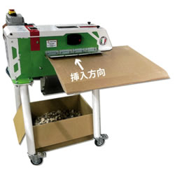 | 使い古しのダンボールをその場で、商品出荷時に扱いやすいチップ状の梱包用緩衝材に作り替えます。 段ボールを業者に送り、費用をかけて再生処理や廃棄する代わりに、御社自らダンボールのリサイクル・リユースが可能となり、SDG`s目標に歯配慮した取組を積極的に推奨できます。 さらに、発泡バラ緩衝材等が不要となり経費節減の実現も可能です。 ![]() ■ダンボールシュレッダー緩衝材チップ製造機導入の大きなメリット ![]() ■見事な速さでチップ状緩衝材に生まれ変わります。 シングルからダブルカートンまで14~16mmの厚さと300~400mm幅のダンボールを一度にチップ上の緩衝材に加工でき、幅の広い段ボールは最大加工幅以上の部分は切り離し、再度加工することができます。 ※機種により最大加工幅と厚さが異なります。 ![]() 三相3馬力のパワフルモーター採用により使い古したダンボールを14m/分の速い加工スピードでチップ状緩衝材に作り変えます。 パワフルな割に騒音が55デシベル程度で音がうるさくありません。 ![]() ■高い安全性を備えています。 手で押せば素早く作動できるよう、赤く大きな緊急停止スイッチボタンが目立つ場所に配置されています。 ![]() 動作中に本体上部扉(ハッチ)を開けた場合、安全装置が作動し、カッターローラーの動作が停止するよう設計されています。 また、本体上部の大きな覗き窓から内部のローラーに異常がないか、目視で確認できます。 ![]() ■壊れにくい安定した性能が長持ちします。 機械のケースは出荷現場における激しい仕様基準をクリアできる鋼板を採用しています。 ![]() 一体加工・熱処理された特殊形状のローラーと堅牢なベアリングにより、長時間に渡る加工に耐え、常に一定の性能を確保しています。 また、ホチキスの針やクリップにより刃先が破損しません。 ![]() ■一目で分かりやすいスイッチ配置です。 シンプルで明瞭なスイッチ方式により段ボールの搬送方向の切り替えと電源のオン・オフの操作がとても簡単です。 ![]() ■お手入れも移動も楽にできて手間が要りません。 ●本体前面に注油口があるので内部へのグリスアップはノズルを差込シリンダーを押すだけで簡単に行えます。 ![]() ●4輪すべてレバーストッパー付のキャスターにより簡単に設置場所を移動できます。 ![]() ●上部扉(ハッチ)をあけるだけでカッターローラにアクセスできるので、掃除機や集塵機で段ボールの紙片や紙粉を簡単に取り除くことができます。 ![]() ●集塵口が本体前面に標準装備されているため、集塵機を取り付ければ防粉することができます。 ![]() ●キャスター付きで容易に移動ができます。 ●シングルカートン段ボールの2枚重ねと強化ダブルカートン段ボールが加工できます。 ●幅の広い段ボールでも、2-3回通すことで加工できます。 ●紙詰まり解消用逆転スイッチと緊急停止ボタンを兼ねた操作ボタン ●安全と耐久性が十分に備わったイタリア品質 ●集塵口に集塵機からのホースをつないで、加工時の紙粉を吸い取ることができます。 ●注油と掃除が容易なメンテナンス設計 ●三相200V電源仕様 ■仕様