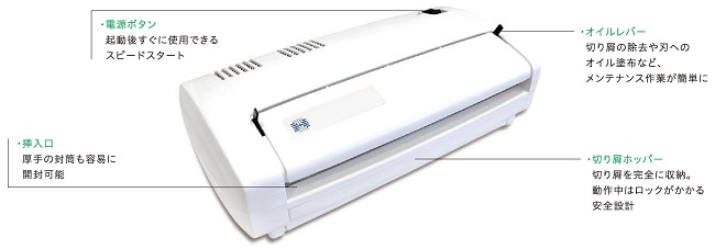 | 毎日の郵便物を素早く、きれいに封入物を傷つけずに開封。 多くの学校や官公庁、銀行などでご利用いただいています。 手差しタイプで厚さ6mmまでの郵便物に対応 ![]() ■特長 毎日受け取る郵便の開封作業のために、多人数でハサミなどによる開封作業を行うことは、人件費などコストプッシュの要因となります。 本製品は一台で多量の郵便物を静かに速く開封処理できます。 時間と労力と人材を他の仕事に振り向けることで、企業の生産性を高めることもできます。 ![]() ●省スペース設計 コンパクトでスマートな外観。設置場所を選びません。 ●安全設計 過負荷の場合、ブレーカーが働いて自動停止する安全設計です。 ●切り屑収納 切り屑は、切り屑ホッパーに完全に収納されるので、散乱する心配はありません。 ●容易な操作性 機械のスイッチを入れ、中で回転しているロータリーカッターに開封する封筒の側面を当てるだけ。簡単な操作で、スピーディーに開封します。 ■仕様